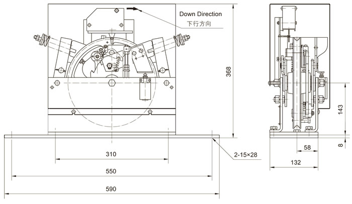 本限速(sù)器是與雙向安全鉗配套使用的雙向限速器。限速器下行製動方(fāng)式與普通下(xià)行限速器(qì)相同,限速器上行製動原理與下行製動原理完全相同,由於采用了帶偏心輪的擺臂式漲緊裝置,使(shǐ)上行製動更加安全可靠。限速器(qì)上部安裝時,必須使限速器繩輪上(shàng)所示的箭頭方向指(zhǐ)向轎廂(xiāng)下行(háng)的(de)方向;限速(sù)器下部安裝時,應使偏心輪始終與擺臂的尾端相(xiàng)接處,並使下(xià)繩輪能夠向(xiàng)下擺動(dòng),但不能向上擺動。